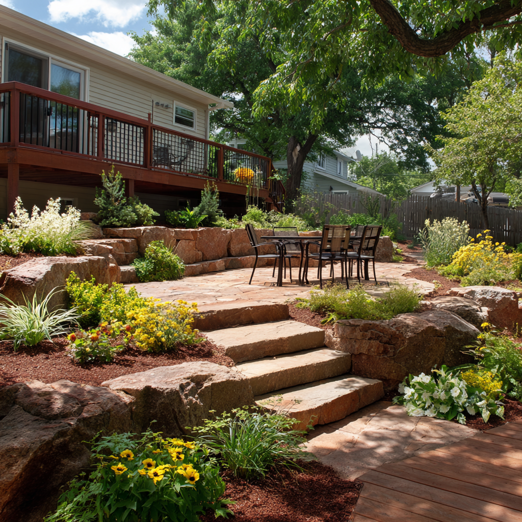 The tiered approach creates multiple flat zones at different elevations connected by steps. Each level serves different purposes. This approach often maximizes usable space better on steep Edina properties. Tiered designs work when your slope is steep, you have different age kids needing different spaces, you want variety of activities, or your property depth is limited but you have vertical space to work with.