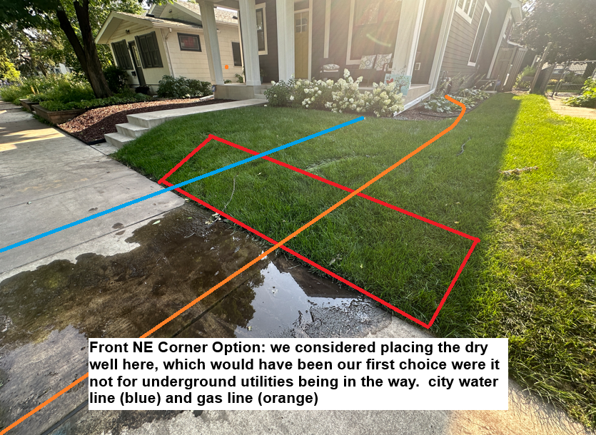 The ideal location was initially the front northeast corner of the yard. However, this area contained both water and gas utility lines directly within the proposed excavation zone. Since the dry well would be approximately 4 feet deep, installing it there posed an unacceptable risk of utility damage during excavation with a mini excavator.