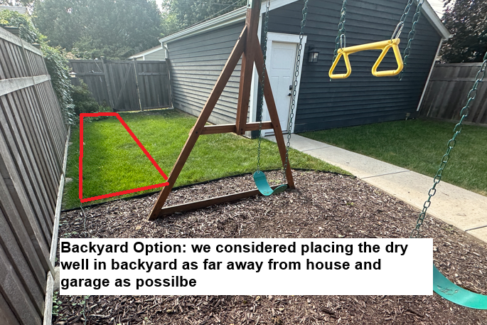We considered placing the dry well in the backyard, but this area was nearly level with the sump pump discharge elevation. As a result: