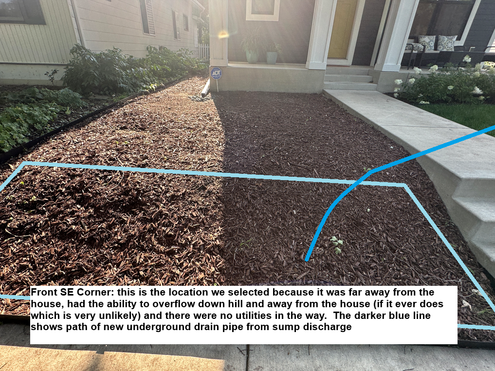 To avoid these hazards, we ultimately selected the front southeast corner of the yard. This location met all performance and safety criteria, though it required running the drain pipe beneath the sidewalk from the north side of the house to reach the final dry well location.