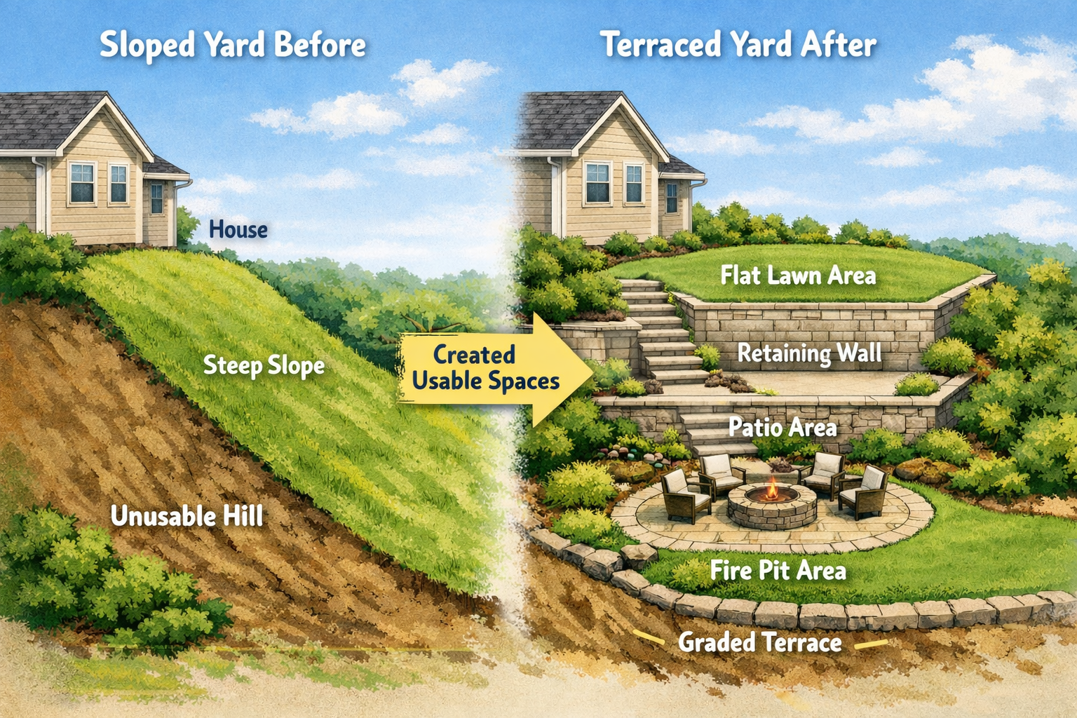 Many homes across in the Twin Cities Minneapolis, St. Paul, and the surrounding Twin Cities suburbs are built on sloped or hilly lots that limit how families can use their outdoor space.