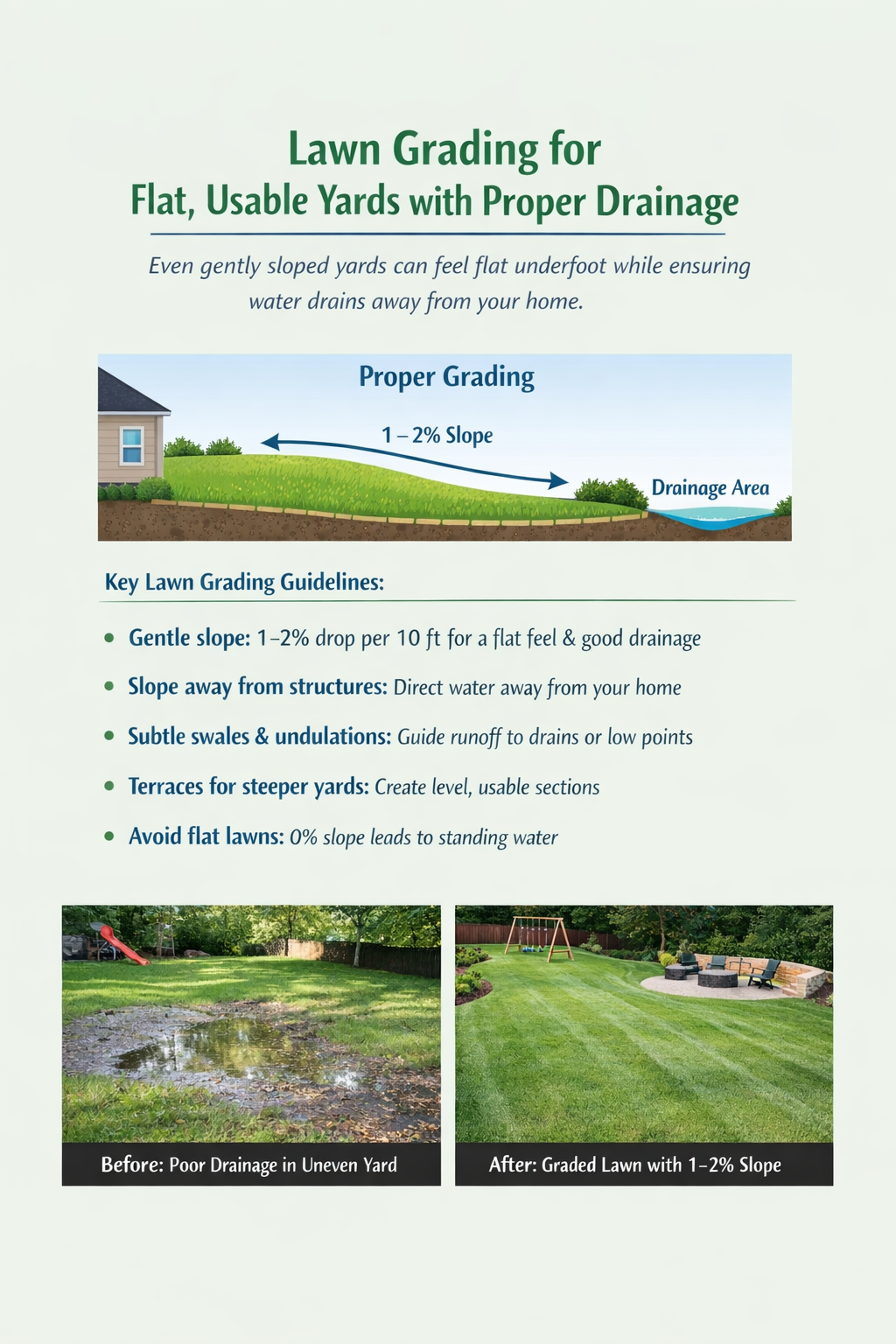 We also integrate grading with existing drainage systems such as downspouts, sump pump discharge lines, and buried drain tile when needed. All grading work is finished with smooth transitions and properly prepared soil, creating a smooth surface for sod, seed, or landscaping while improving long-term drainage performance.